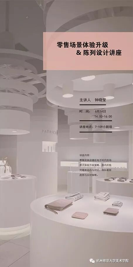 杭州师范大学美术学院公共艺术专业陈设教研室邀请了拥有150万+粉丝的公众号“陈列共和”创始人钟晓莹老师,于6月14日下午14:00-16:00为美院学子开设一场《零售场景体验升级与陈列设计》讲座。