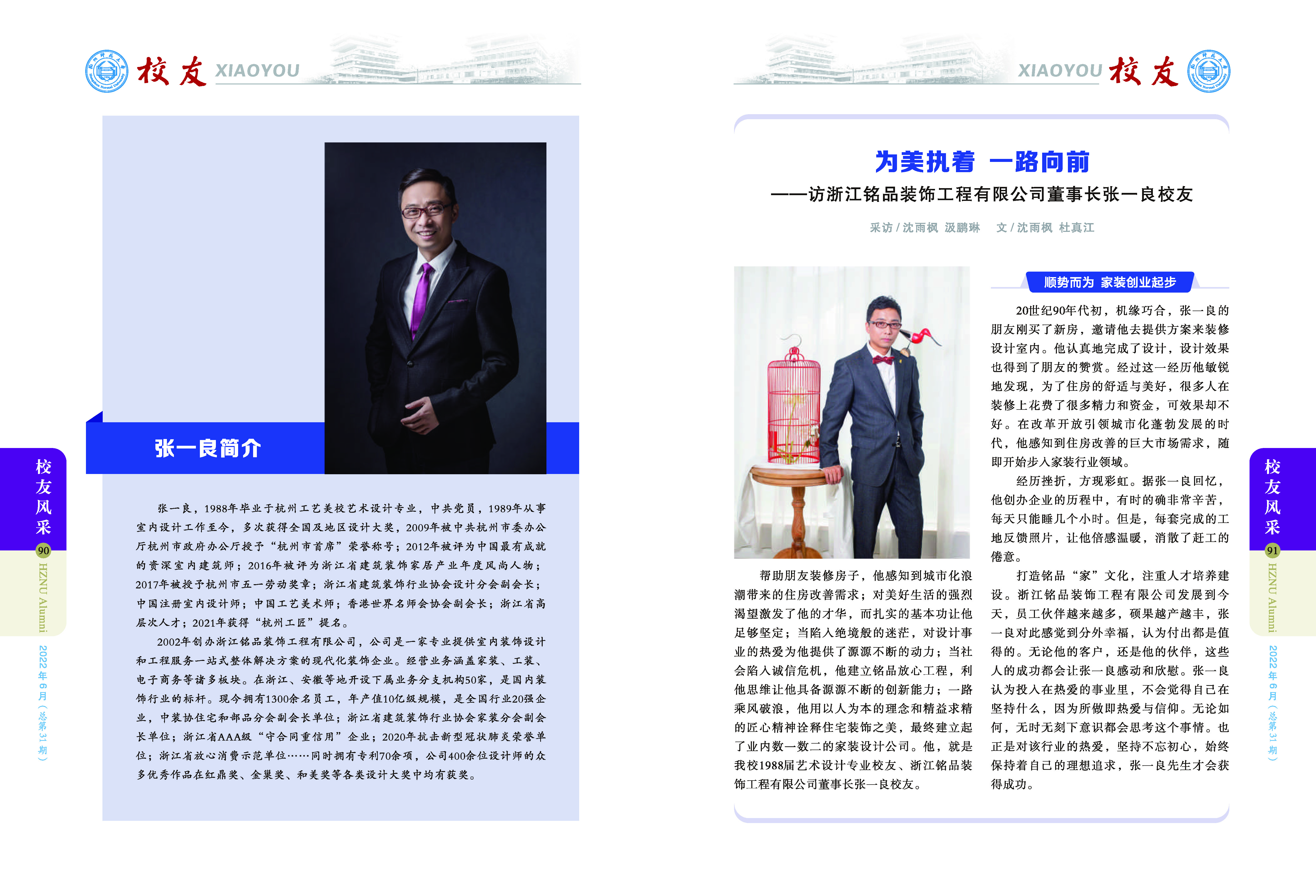 2002年创办浙江铭品装饰工程有限公司,公司是一家专业提供室内装饰设计和工程服务一站式整体解决方案的现代化装饰企业。经营业务涵盖家装、工装、电子商务等诸多板块。在浙江、安徽等地开设下属业务分支机构50家,是国内装饰行业的标杆。现今拥有1300余名员工,年产值10亿级规模,是全国行业20强企业,中装协住宅和部品分会副会长单位;浙江省建筑装饰行业协会家装分会副会长单位;浙江省AAA级“守合同重信用”企业;2020年抗击新型冠状肺炎荣誉单位;浙江省放心消费示范单位……同时拥有专利70余项,公司400余位设计师的众多优秀作品在红鼎奖、金巢奖、和美奖等各类设计大奖中均有获奖。