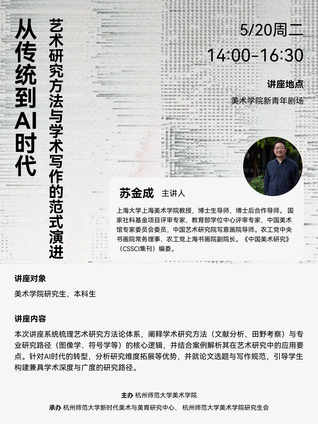 本次讲座将系统梳理艺术研究的方法论体系,围绕最新学科分类,深入阐释学术研究方法(如文献分析、实地考察)与专业研究路径(如图像学、符号学、比较研究、跨学科研究)的核心逻辑,并结合实际案例解析其在艺术实践中的应用要点。