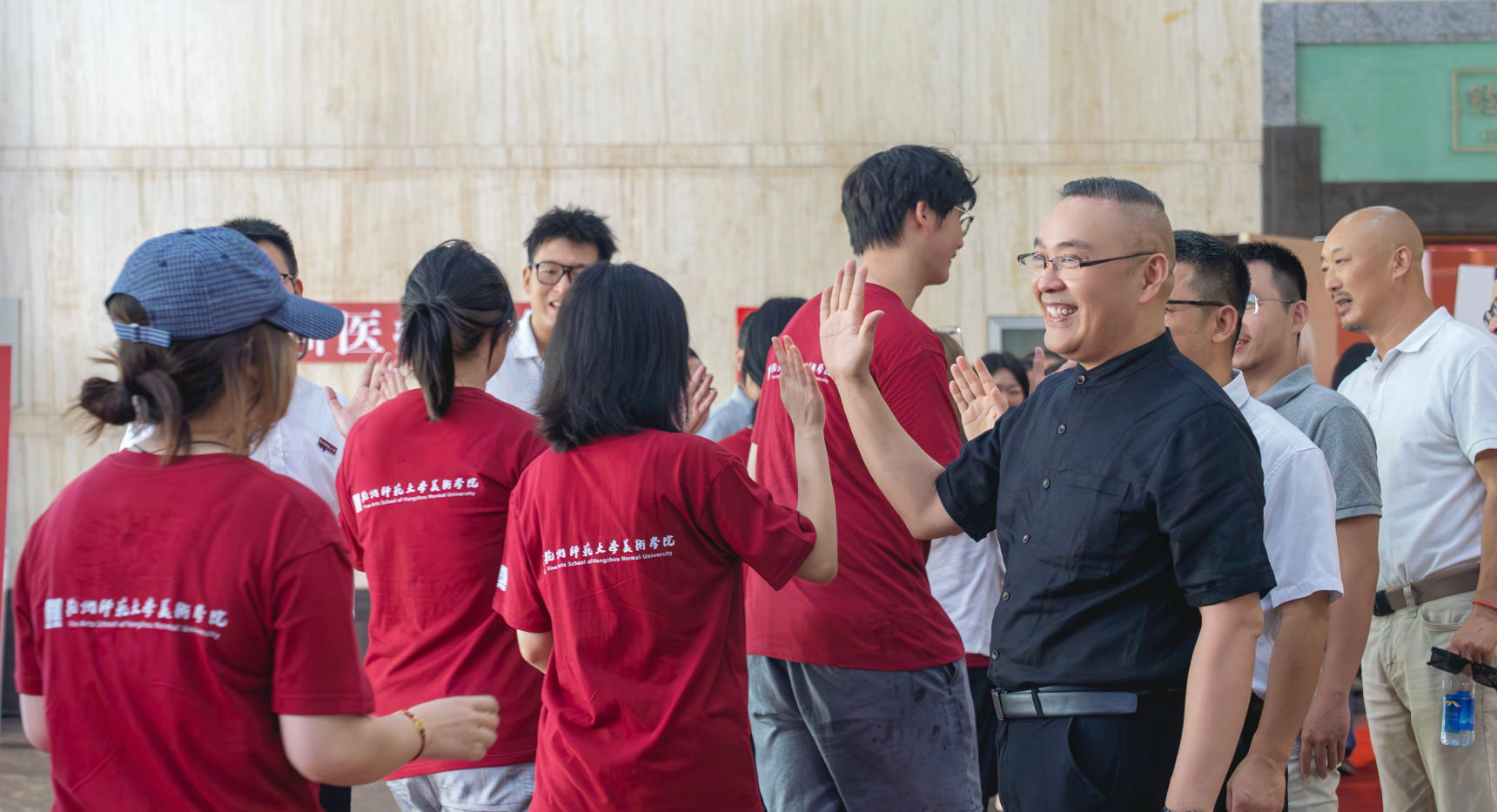 红毯初履,是新生与美院的第一次温柔对话。场外,身着学院定制文化衫的新生们高举班牌,在播报声中有序踏过红毯;两侧,老师们以掌声与击掌传递期许,让“一个师傅领进门”的寓意,成了新生入学的第一份温暖记忆。