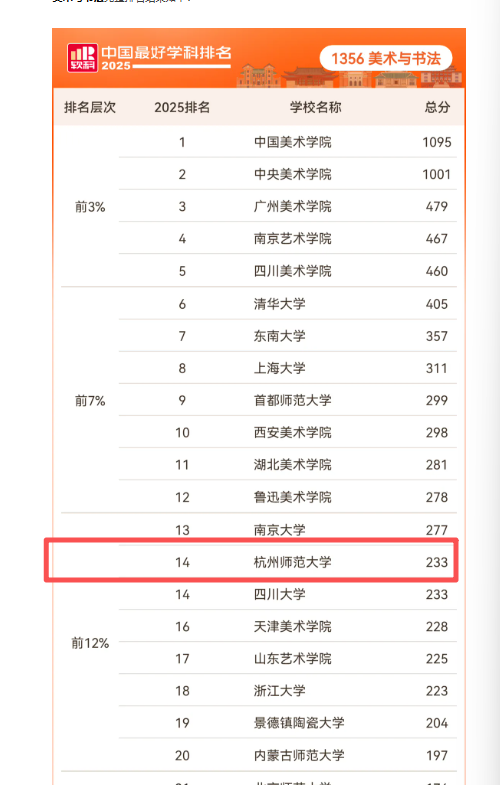 软科中国最好学科排名(专业学位类别)指标体系包括人才培养、师资队伍、研究创作、学术论文和社会声誉5个指标类别,下设18个指标,共计100多项观测变量。在“美术与书法”专业学位类别排名中,全国有87所高校上榜。此次杭州师范大学“美术与书法”位列全国第14位,省内排名仅次于中国美术学院。