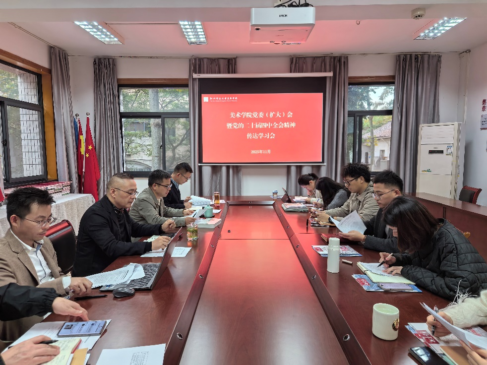 11月4日,美术学院在玉皇山校区召开党委扩大会暨党的二十届四中全会精神传达学习会。党委书记倪洪江主持会议,传达领学党的二十届四中全会精神、郭东风书记在学校党委扩大会议上的重要讲话精神并作中心发言。院长王中焰等学院全体党委班子成员出席。学院全体党支部书记、组织员等参加会议。